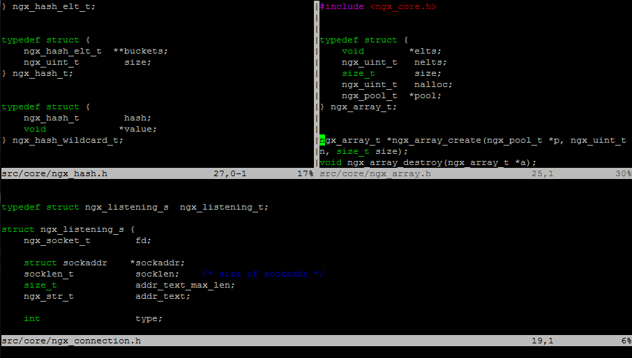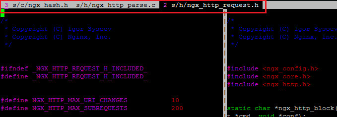 你可以看到Vim打开了四个文件,编号是4,5,6,7,如果你要切换打开的文件,这个时候,你不要按回车(按了也没事,只不过按了就看不到:ls输出的buffer列表了),你可以使用下面的命令切换文件(buffer后面的4表示切到4号文件也就是src/http/ngx_http.c):