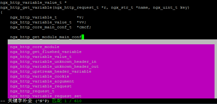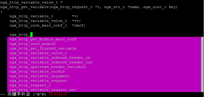 下图是我输入了ngx_http_然后按ctrl+n出现的样子,它已经帮我补全了一个,但是我不想要这个。然后,在Vim的下方我们可以看到状态变成了“关键字补全”,然后后面有^N^P的提示,意思就是告诉你还有一个Ctrl+P.