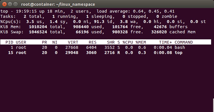 [email protected]:~$ sudo ./pid.mnt Parent [ 3502] - start a container! Container [ 1] - inside the container! [email protected]:~# ps -elf F S UID PID PPID C PRI NI ADDR SZ WCHAN STIME TTY TIME CMD 4 S root 1 0 0 80 0 - 6917 wait 19:55 pts/2 00:00:00 /bin/bash 0 R root 14 1 0 80 0 - 5671 - 19:56 pts/2 00:00:00 ps -elf