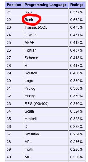 - 每个月tiobe上都会给一个编程语言的排名,来显示各种语言的流行度。排名指数综合了全球范围内使用该语言的工程师人数、教学的课程数和第三方供应商数。截止至2012年11月份,tiobe公布的编程语言排行榜里,bash的指数是0.56%排名22位。如果算上它旗下的awk 0.21%和tcl 0.146%,大概就能排到14名。注意这里还不包括bash的同源的兄弟姐妹csh、ksh等,算上它们,shell家族有望接近前十。值得一提的是一直以来shell的排名就很稳定,不像某些“暴发户”语言,比如objective-c,这些语言的流行完全是因为当前Apple系的崛起,但这种热潮极有可能来得快去得更快。