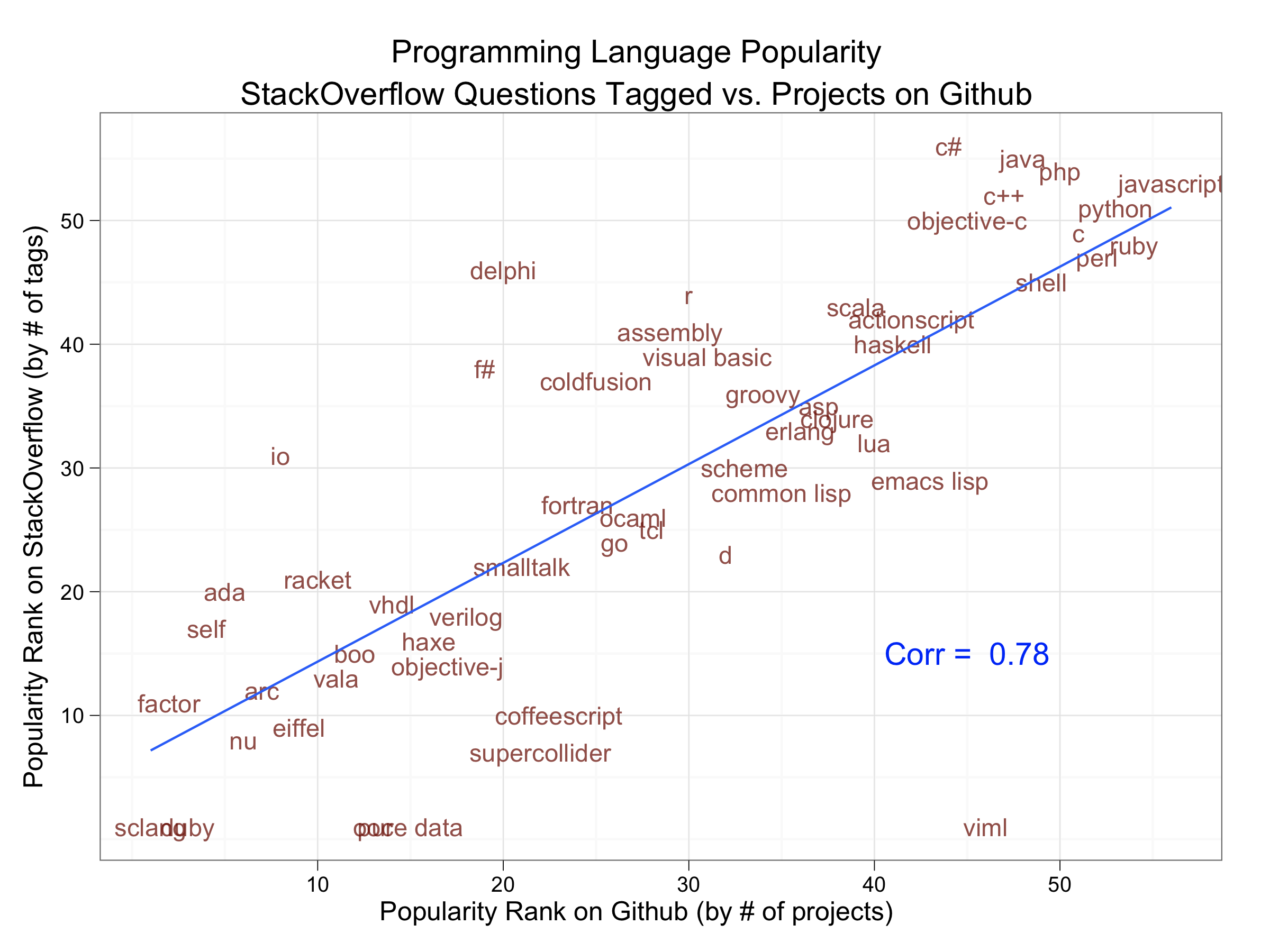 下面是一个关于编程语言流行度的图(以前本站也有一篇编程语言流行度的文章)。其X轴是从Github中取来的数据(项目数),而Y轴是从StackOverflow取来的(tag数)。注意:Github提供了语言流行度:https://github.com/languages,而本图的原始数据在这里