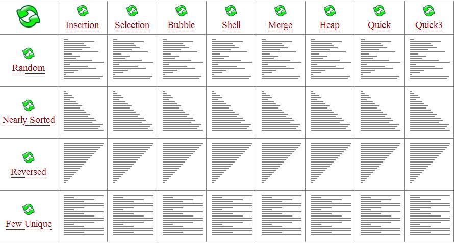 下面是一个日本程序员制做的一个可视化的排序过程,包括了各种经典的排序算法,你可以调整速度和需要排序的个数。酷壳以前也介绍过几篇相关的文章 一个排序算法比较的网站一个显示排序过程的Python脚本 关于各种排序算法的运行复杂度比较,请参看Wikipedia的排序算法比较
