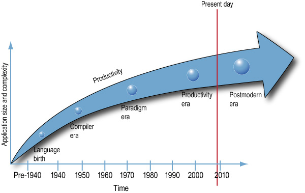 第一张是比较宏观的,来源在这里,虽然是去年的,但还是比较不错的,其把计算机编程语言分成了五个时代——